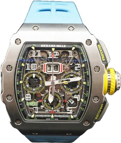 This titanium-cased Richard Mille RM11-03 demonstrates the brand’s mastery of openworked dial architecture within the substantial 50mm x 16.23mm case dimensions that define the collection’s bold presence. The skeletonized dial reveals the intricate RMAC3 movement beneath, its Arabic numerals providing functional legibility against the mechanical complexity. Sourced from the secondary market in exceptional condition with minimal wear signs, this particular RM11-03 includes original box and papers documentation. The blue rubber strap creates a striking contrast against the titanium case construction, emphasizing the watch’s contemporary sporting character.